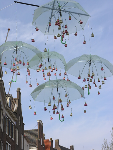 De Middelburgse kunstenaars Bert van Wijk, Joke Apner en Hanny Mallekote hebben de Lange Delft in Middelburg dinsdag versierd om kunst in het straatbeeld te brengen en daarmee mensen aan het denken te zetten. Ze deden dat op 1 april, bij wijze van grap en in het diepste geheim.